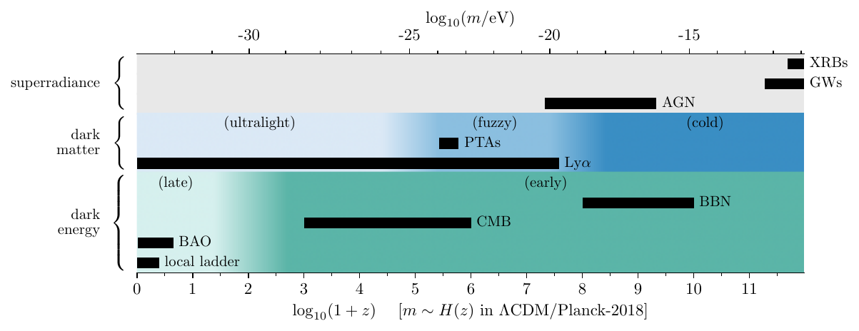 In the canonical quintessence scenario, a massive scalar field has an effective equation of state that transitions from \(w\approx -1\) to \(w \approx 0\) at the epoch \(m\sim H(z)\) (Turner 1983; Marsh 2016). Variations on this theme are known to strongly affect the Hubble tension via early dark energy models, and may be useful in response to recent signals for dynamical dark energy at late times. Such effects can, in principle, be constrained even through to Big Bang nucleosynthesis (BBN), beyond which the expansion history becomes speculative. As with ULDM, applications of light bosons to dark energy require extended models with tuned initial conditions.