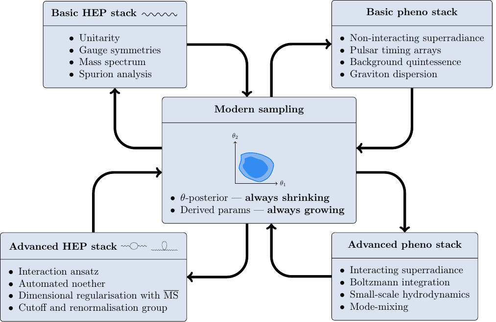 An associated problem is the lack of a physical measure on the \(\Coupling{}\) hypercube. It is interesting to consider whether the derived quantities, such as masses, can help to define such a measure. The \(\Coupling{}\) parameterisation is also arbitrary, and follows from the conventions in (Barker, Marzo, and Rigouzzo 2024; Barker, Karananas, and Tu 2025). A more natural parameterisation factors out mass dimensions, with parameters of common dimension spanning hyperspheres. Moreover, the full processing of a given model is hierarchical: gauge hypersurfaces, where identified in a parent theory, give rise to constrained models, and so on. These models are numerically discovered and numerically defined, which is a property that the original parameterisation does not share. It becomes necessary to either reverse-engineer the constraint (for example, via symbolic regression), or to soften the physical properties of the science stack in a way that remains stable as child-theories are discovered at increasing depth.